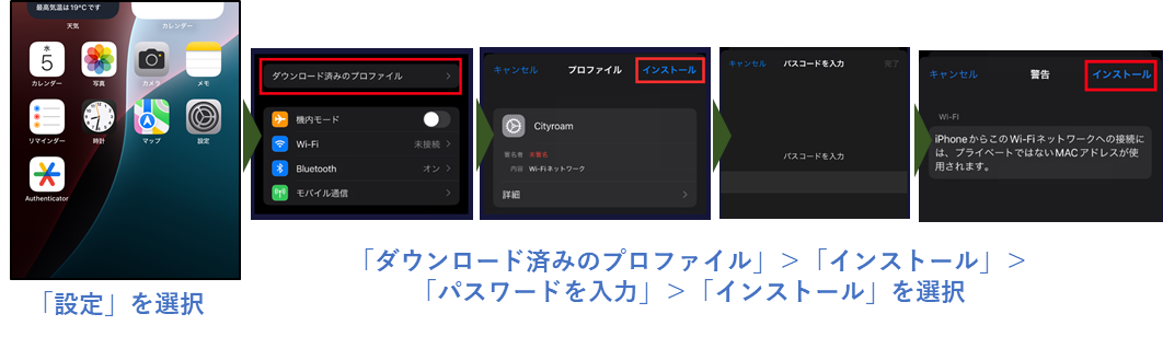 - Select ‘Downloaded Profile’ → ’Install’ → Enter your password → Select ’Install’.