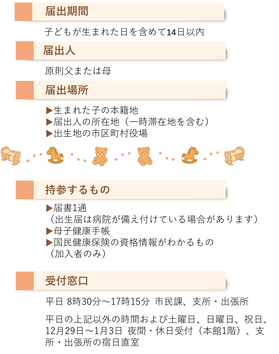 • 出生届は、土曜日、日曜日、祝祭日も受付していますが、母子健康手帳への証明や児童手当の申請、こども医療の申請、国民健康保険への加入は、翌日以降の市役所の窓口が開いている時間にあらためて手続きをしてください。なお、住民票の必要な人は住民登録地に、戸籍の謄本や抄本が必要な人は本籍地にそれぞれお問い合わせください。