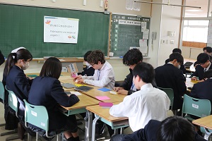 9月2日(火曜日)の6時間目、広島大学大学院人間社会科学研究科の猪凌太朗さんをお呼びして、2年5組で「SELプログラム」の授業を行いました。(全7回のうちの5回目。「SELプログラム」については、中央中HPの「研究推進計画」をご覧ください。)「クラスの友達」をテーマに、自分とクラスの友達との共通点と相違点を知り、友達との付き合い方について自分の考えをまとめました。授業は終始和やかな雰囲気で進んでいき、取組の成果が表れていました。これからも「SELプログラム」での学びを生かし、より良い人間関係を作っていってほしいと思います。
