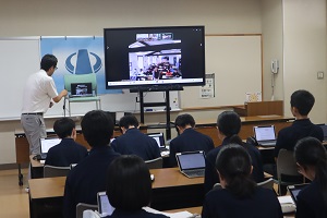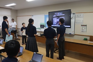 11月27日(水曜日)に2年生3名が中国の徳陽市第五中学校とオンラインで交流を行いました。東広島市は中国徳陽市と友好都市提携を締結しています。「おしゃべりチャット」と題して、自己紹介やお互いの学校についての質問をしながら交流しました。英語でスピーチをし、お互いの様子を英語でコミュニケーションすることができました。交流に向けて、英語教員と一緒にスピーチを一生懸命練習していた成果を発揮できていました。交流した学校は生徒数3000人だったそうです。