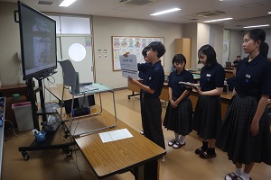 9月18日(木曜日)、2学年代表生徒がサン=ドニ中学校の生徒とオンライン交流をしました。(時差の関係で放課後に行いました。)5、6人のグループごとに、日本語とフランス語で書いた紙を見せながら学校行事について紹介しました。また、「日本の歌『四季』」の合唱を披露したり、体育大会のダンスを一緒に踊ったりして、たいへん和やかな交流となりました。2月の学校訪問に向けて、お互いの学校のことをもっとよく知っていきたいと思います。ホストファミリーは、あと男子6名の受け入れが必要です。重ねてご協力のほどをよろしくお願いいたします。