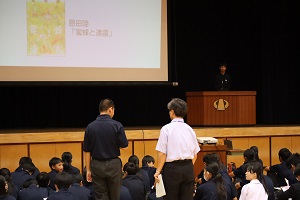 8月25日(月曜日)、前期後半が始まりました。1時間目の前期後半開始の集会では、校長先生が『論語』の「過ちて改めざるこれを過ちという」という言葉を紹介され、「この夏休みは楽しかったという人もいれば、反省や後悔をしている人もいるかもしれません。難しく言うと過ちです。しかし、その過ちを素直に認めて直していけば、それは過ちとは言いません。今日から始まる前期後半は失敗や間違うことを恐れず、いろんなことに挑戦していってください。」と話されました。続いて新しく来られたALTのティナ=ウィン先生の紹介がありました。そのあとフランスのサン=ドニ中学校生徒の自己紹介ビデオを見ました。最後に夏休み中の部活動の表彰式を行いました。夏休みのさまざまな経験をこれからの生活に生かし、さらに成長していってほしいと思います。