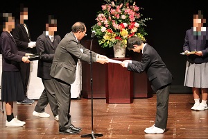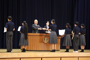 10月10日(金曜日)、令和7年度前期終業式を行いました。最初に校長先生から「四苦八苦」についてのお話がありました。そして、この苦しみから抜け出すには「他人を喜ばせること」という心理学者アドラーの言葉を紹介され、「利己利他」の精神で後期も頑張っていきましょう、と締めくくられました。続いて生徒指導主事の上田先生から前期の振り返りと秋休み中の過ごし方についてのお話がありました。最後に前期後半の表彰式をしました。秋休みが明けたら、習熟度テスト、各部の秋季大会、文化祭と盛りだくさんです。自分の頑張りが友達や仲間、保護者を喜ばせることになる、そういう思いで頑張っていきましょう。