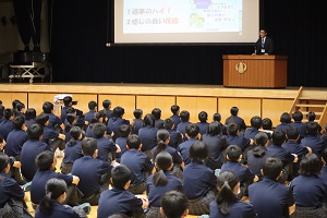 11月1日(金曜日)・5日(火曜日)・7日(木曜日)を学校行こう週間として公開授業を行いました。来校いただきました保護者の皆様、ありがとうございました。学校行こう週間では、命について考える機会を設けることとしています。その1つとして、全校で『がん教育』を行いました。がんに対する正しい知識と健康や命の大切さについて主体的に考えることをねらいとし、東広島医療センター副院長 豊田 和広様を講師として招聘しました。がんの現状や予防、早期発見、がん患者への理解と共生などについて専門的な立場からわかりやすくお話しいただきました。自他の健康と 命の大切さについて学び、共に生きる社会づくりに寄与する資質や能力の育成を図っていきたいと考えています。