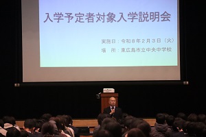 2月3日(火曜日)、令和8年度入学予定者対象入学説明会を行いました。6年生と保護者、合わせて400名以上に参加していただきました。最初に東広島警察署の方に来ていただいて、SNS等の危険性について話してもらいました。続いて校長先生が中央中学校の校訓や学校教育目標、和文化教育などについて説明し、教務主任と生徒指導主事が「小学校と中学校の違い」、「中学校生活で頑張ってほしいこと」などを説明しました。6年生は保護者と一緒に冊子を見ながら、しっかりと説明を聞いていました。中学校は社会に出ていくための準備をするところです。いろいろなことを経験しながら人として成長してほしいと思っています。4月の入学を、教職員一同心待ちにしています。