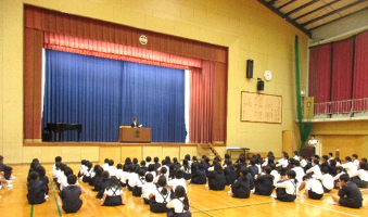 10月10日(金曜日)1校時、小・中学校合同で前期終了式を行いました。校長から、前期の学校行事でのがんばりや、授業や部活動での日々の努力の素晴らしさを伝え、小中それぞれの校歌を斉唱し、前期のしめくくりとしました。本校では、目標をもち、なりたい自分になるために今何をしたらよいのかを考え、毎日を大切に過ごすことができる学校を目指しています。後期も引き続き、毎日こつこつと努力を続け、力をつけていってほしいと願っています。