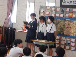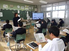 ALTのクリスティーン先生が児童生徒に絵本の読み聞かせを行ってくださいました。昼休みの時間、図書室に児童生徒が集まり、静かに聞き入っていました。普段は英語の授業で指導をしていただいていますが、絵本の読み聞かせを英語でしていただくのは初めてです。読み終わった後、英語で質問をしてもらい、児童生徒は英語で答えていました。児童生徒が英語に触れることができる時間になりました。