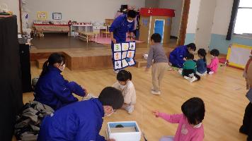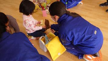 中学校3年生が家庭科の学習で「認定こども園たけに」に訪問し、保育実習を行いました。自分の作った手作りおもちゃで披露して一緒に遊んだり、園庭で過ごしたりしました。お兄ちゃん・お姉ちゃんに遊んでもらったことを園児がとても喜んで、保育園からも「また来てほしいです」と言っていただきました。