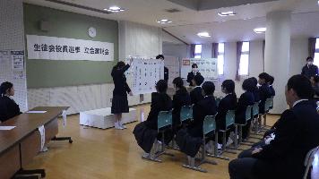 今年度、学力の向上として自学を進化させる取組を行うこととし、全校生徒暮会で研究主任が説明をしました。