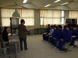 広島大学工学部長 矢吹教授と大学院生による「科学の芽」講座を実施しました。中学校全校生徒で「くだもの電池で電気と化学を学ぼう」と題し、くだものを使った電気実験を体験しました。くだものに電極を刺し、リード線でつなぎ、LEDを光らせました。化学は身近なところから始まることを体感できました。