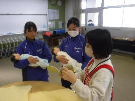 命の大切さに気付いたり、心身の発達について正しい知識を身に付けたりするために、中学校3年生の生徒が産婦人科医・保健師の方から話を聞く「思春期講演会」を実施しました。いまじょうクリニック 今城雅彦院長から「すてきなオトナになるために」と題して話を聞いた後、実際に赤ちゃん人形を使って体験学習を行いました。妊婦体験もあり、将来について考える時間となりました。
