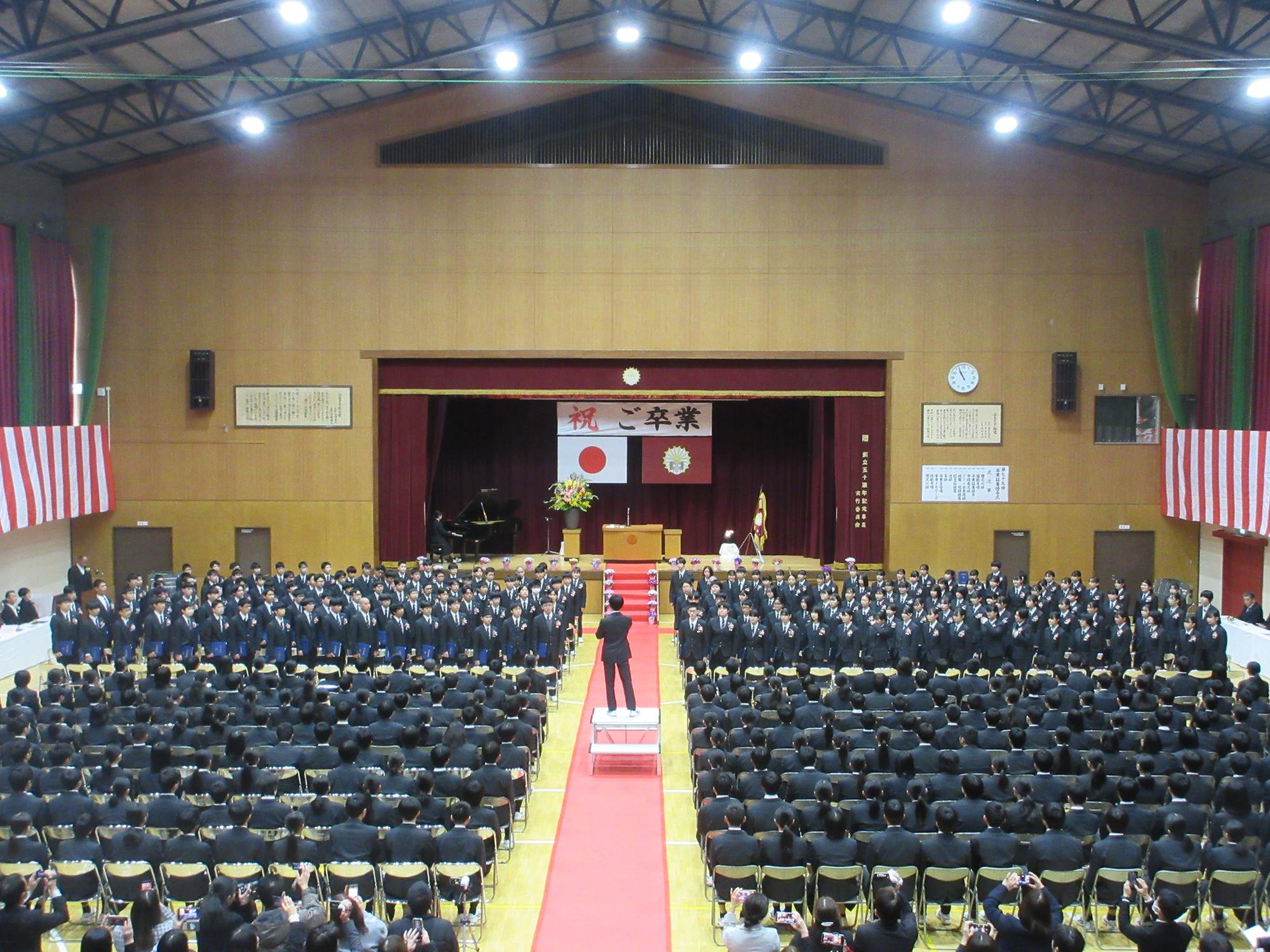 3月6日に卒業証書授与式を挙行しました。厳粛な雰囲気の中、卒業生一人一人が校長先生から卒業証書を受け取り、三年間の学びを終えて本校を巣立っていきました。校長先生から卒業生に対して3つの内容を話されました。一つ目に、夢を持つこと、挑戦すること。二つ目に、仲間と良い対話をしていくこと。三つ目に、失敗を恐れないこと。この言葉を胸に今後のそれぞれの進路で大きく成長していくことを願っています。