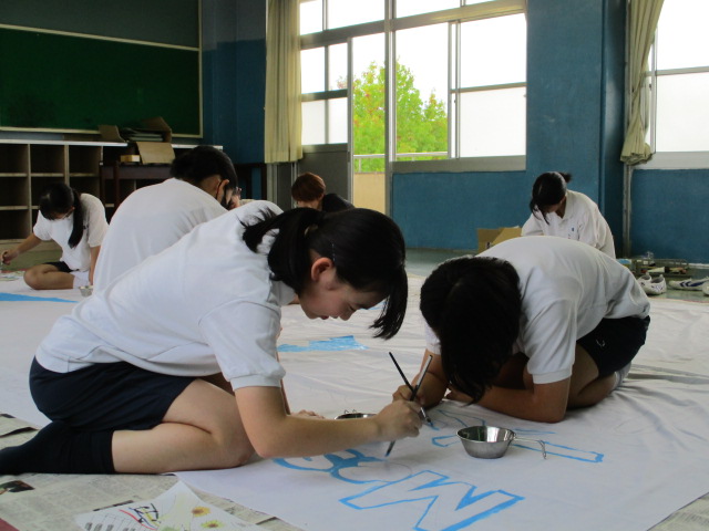 5月31日に行われる体育大会に向けて情報を発信していきます。今回は横断幕についてです。家庭科部が布を合わせ縫い、総合芸術部が絵を描いた体育大会の横断幕が完成しました。現在職員室前に掲示しています。体育大会当日も体育館前に掲示予定ですので、ぜひご覧ください。