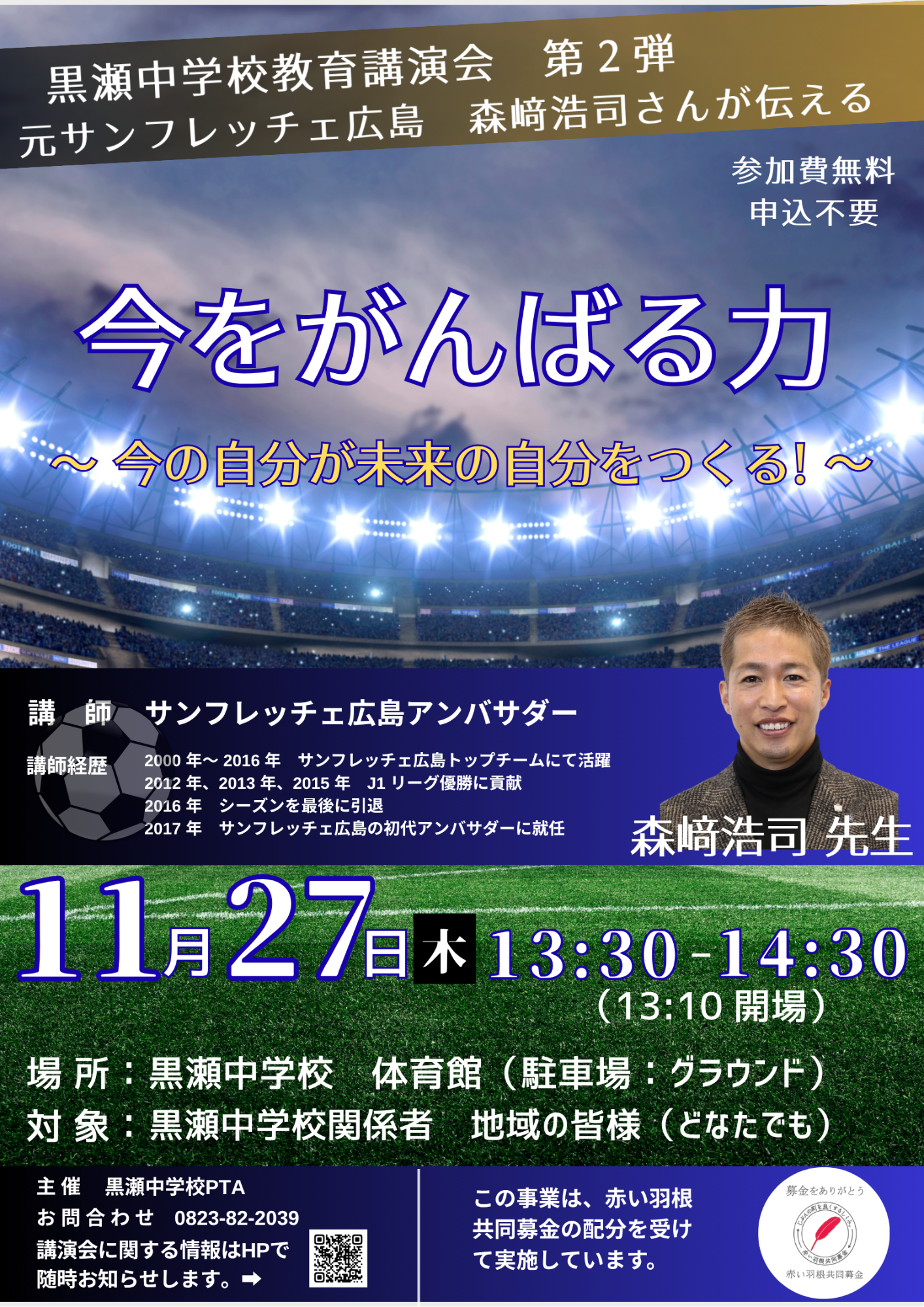 本講演会は、社会福祉協議会による赤い羽根共同募金事業の一環として実施されたものです。第2弾として、11月27日(木曜日)にサンフレッチェ広島アンバサダー 森崎浩司さんを本校体育館にお迎えすることが決定しました。どうぞご期待ください。