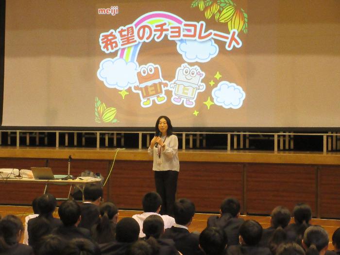 10月22日(水曜日)の5・6時限目に、株式会社明治から講師の加藤先生をお招きし、チョコレートの製造過程やチョコレートの原料であるカカオ豆の生産国(ブラジルやガーナ)が抱える課題についてお話を伺いました。