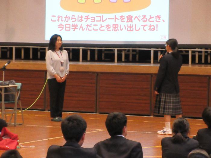 加藤先生からは、カカオ農園での児童労働や環境問題など、チョコレートの背景にある世界の現実を教えていただきました。また、明治が企業としてどのように生産国や生産者を支援し、持続可能な社会づくりに取り組んでいるかについても知ることができました。また、ミルクチョコレートを持って来てくださり、試食することもできました。身近なことから世界の課題へと視野を広げる貴重な時間となりました。
