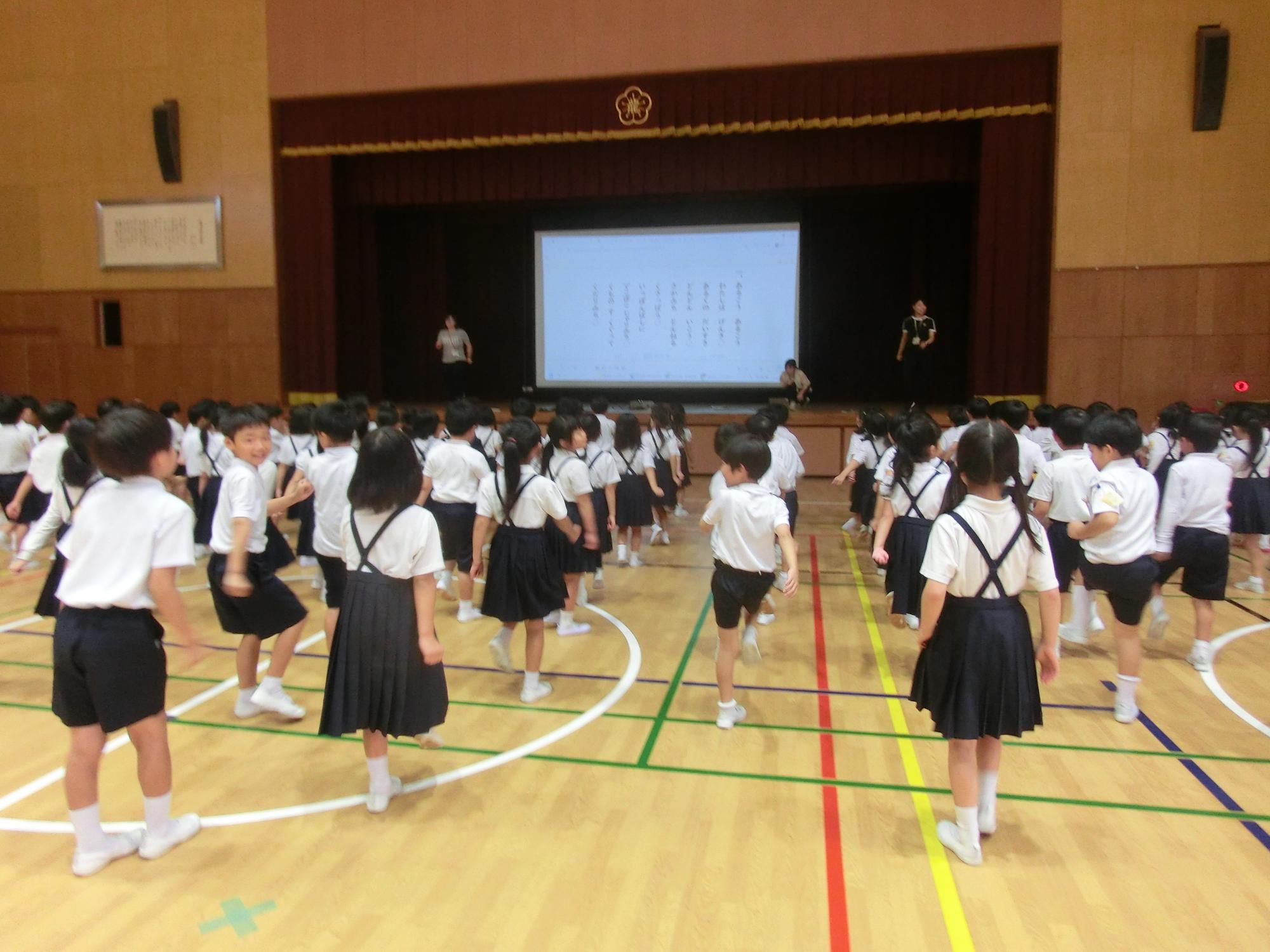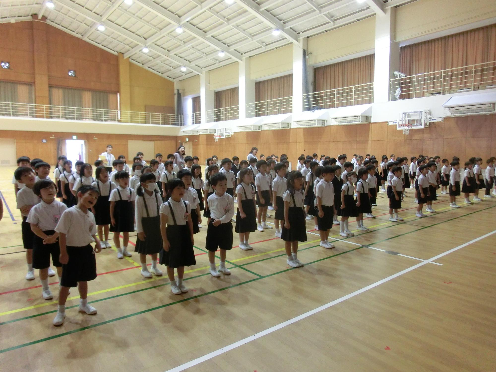 5月2日(木曜日)5校時に,体育館で1年生を迎える会がありました。1年生は,6年生と一緒に入場し,2年生から6年生と一緒にクイズをしたり,ゲームをしたりしました。まだあまり関わったことのない学年の人たちと一緒に遊ぶことができ,龍王小学校の友達をさらに増やす素敵な機会になりました。