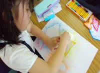 図画工作科の学習で,好きな枠を作って,クレヨンで色を塗り,ティッシュでのばしました。いつもはくっきり見えるクレパスの線も,ぼやっとなったり,しゅっとなったりしました。ぼかした形は,ゆらゆらと見えて不思議な感じがしました。色を重ねると,混ざった色が見えて,きれいでした。いろんな作品に,ぼかしの技を使っていきたいです。