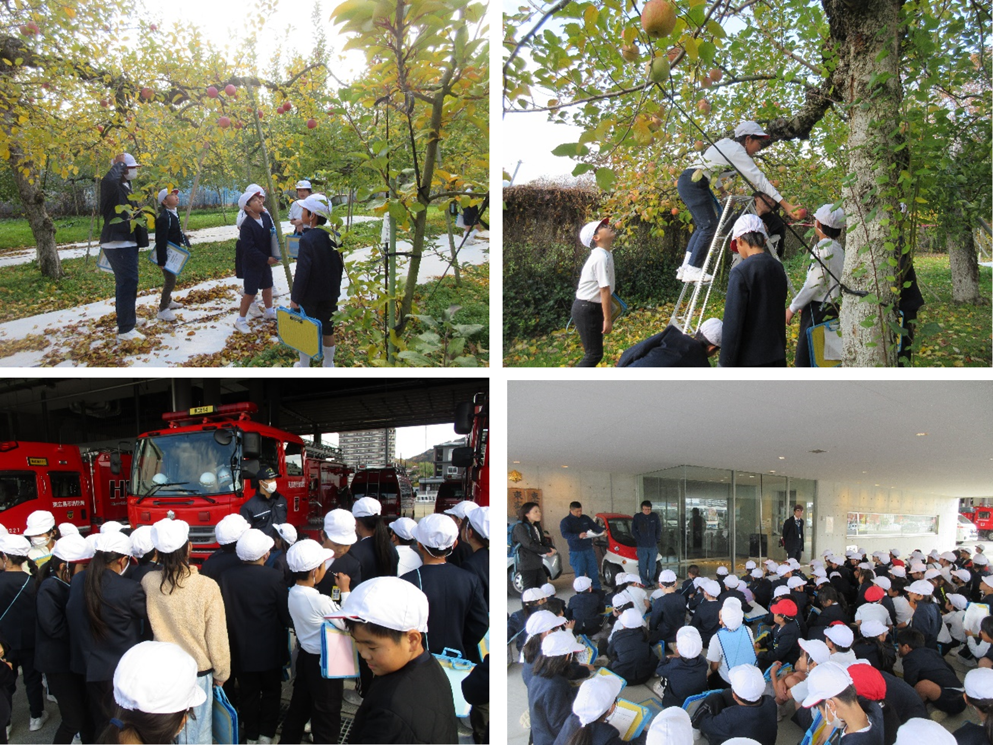 りんご園では,自分たちでお気に入りのりんごを探し,りんご狩りを行いました。東広島市消防局では,社会で学習したことの発展的な学びとして,興味深々でお話を聞くことができました。