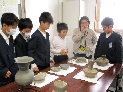 前回に引き続き,「龍王地域未来プロジェクト」の学習で,龍王地域の過去の様子をもっと詳しく知るために,東広島市出土文化財管理センターの方々からお話を聞かせていただきました。龍王地域は遺跡がたくさんあること,龍王小学校の真下から,人が住んでいた形跡が見つかったことなど,驚くような話ばかりでした。その後,出土した遺物を実際にさわる体験をさせていただきました。「思ったより軽い」「切れ味がすごい」など感想を言いながら土器や石器をさわっていました。