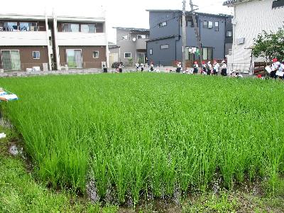7月11日に溝田さんの田へ、稲の成長の観察をしに行きました。5月中旬に植えた苗は10cmほどでしたが,40~50cmほどにのびていました。また,茎も太くなり,数もたくさん増えていました。子どもたちは「こんなに大きくなるんだ。」「もっと大きくなるかな。」と成長を喜んでいました。