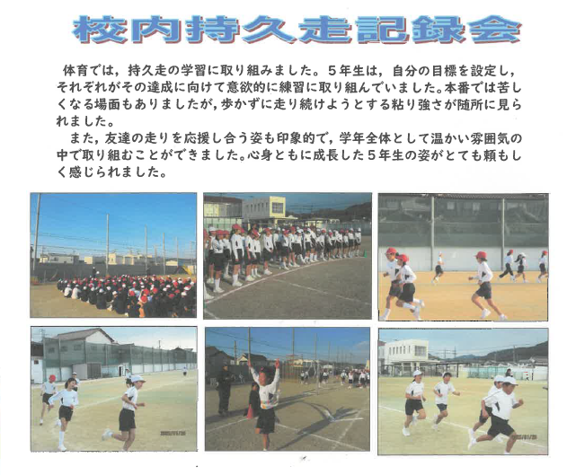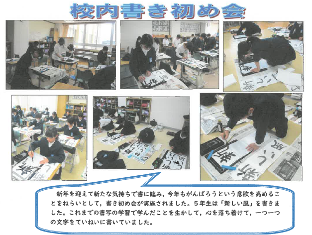 新しい年を迎え,子どもたちも気持ちを新たに元気に学校生活を送っています。後期後半の学校生活が始まり,早くも一か月が過ぎようとしています。5年生の学習では,これまでの学習をしっかりと確認しつつ,全ての学習内容が習得できるよう,子どもたちと一緒に頑張っていきます。また,来年度に向けての児童会長や各委員長の選挙,6年生を送る会に向けての合奏練習,卒業式や来年度の様々な式に向けての代表の言葉のオーディションなど,6年生から5年生へと役割を引き継いでいます。子どもたちのこれからの活躍を楽しみにしています