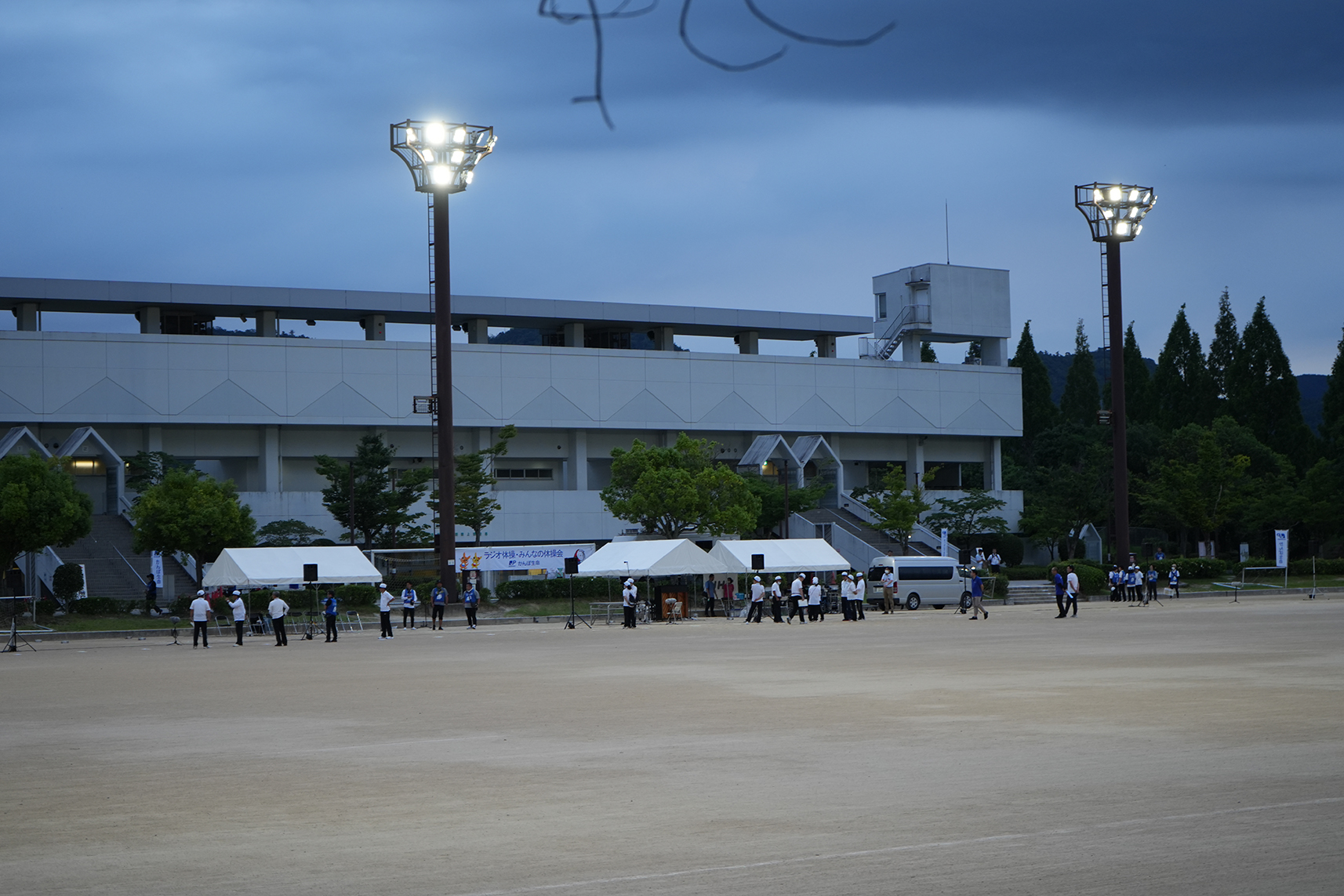 曇り空で迎えた朝5時20分。会場では、運営スタッフによる段取りのチェックや音響確認などの最終準備が行われていました。5時30分になると、早くも参加者が来場し、次々と列をつくります。早朝にもかかわらず会場に集まったのは、親子連れから高齢者まで約1,100人。開会を待ちわびている参加者の様子が見られました。