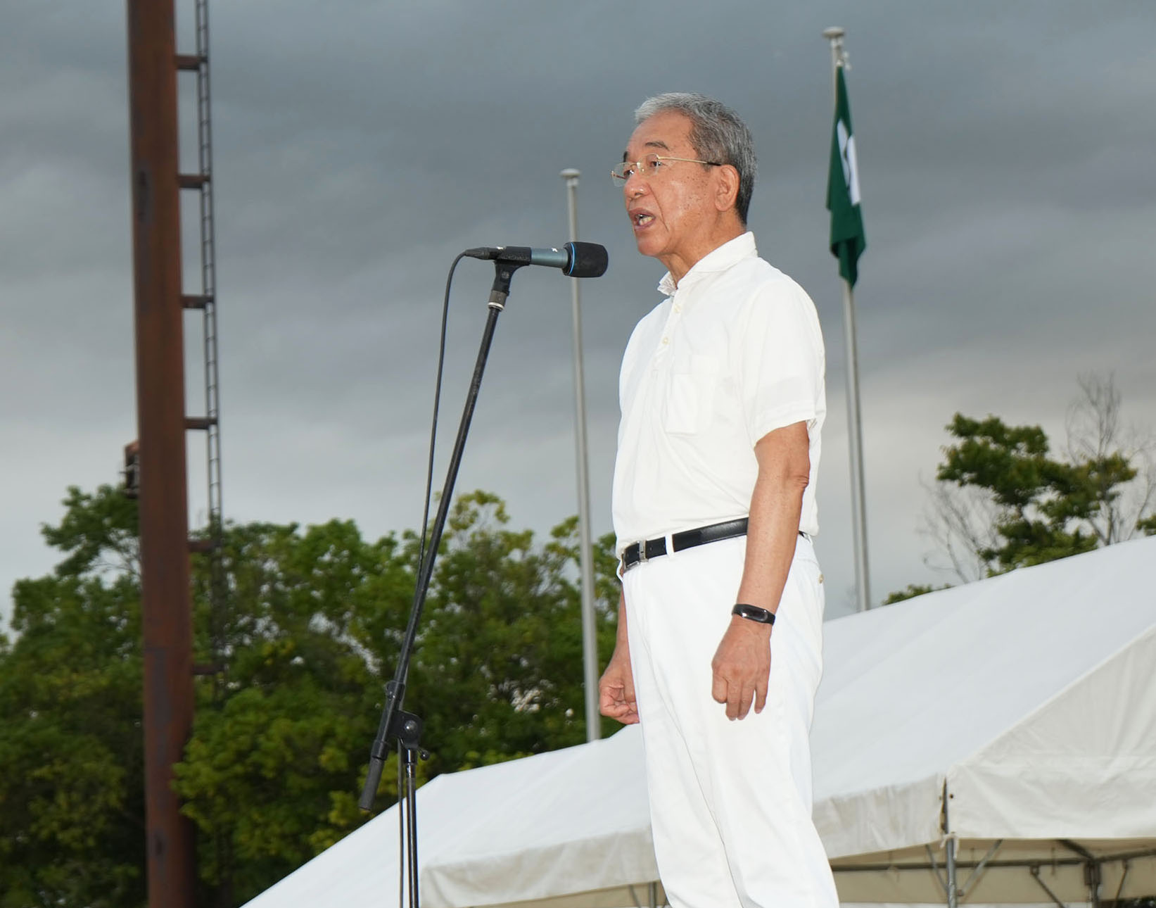 6時、高垣市長のあいさつで「夏期巡回ラジオ体操・みんなの体操会」がスタート。朝早くから参加した皆さんへのお礼とともに、東広島市から全国に元気を届けたいという思いを述べました。
