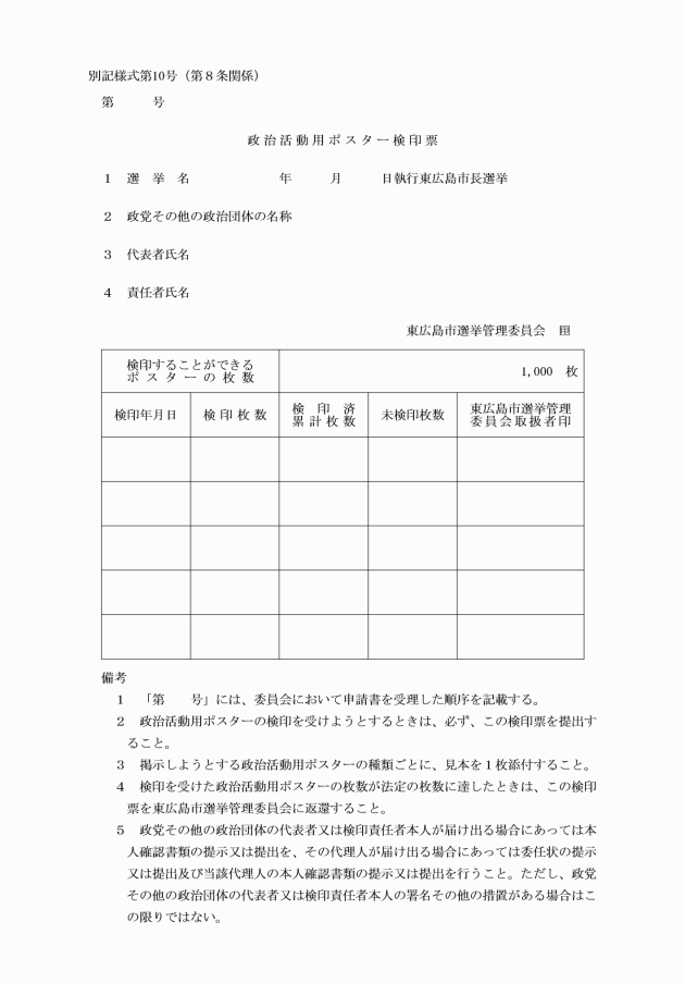 第11条 法第201条の9第1項第6号の規定による届出は、政治活動用ビラ届出書(別記様式第14号)に頒布しようとするビラを1枚(記載内容が異なるものがある場合は、それぞれ1枚)添えてしなければならない。