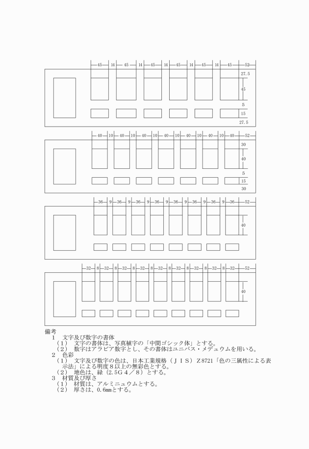 住居表示を行う区域の町の名称及び街区符号を記載した表示板(以下「街区表示板」という。)、住居番号を記載した表示板(以下「住居番号表示板」という。)及び町名を記載した表示板(以下「小型町名板」という。)は、次の基準により設置する。