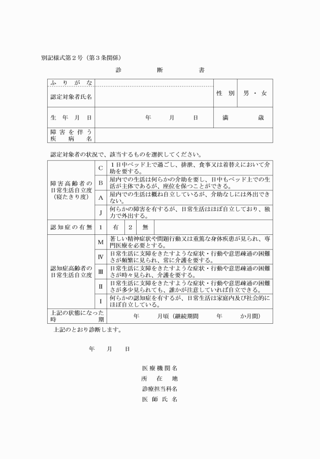 特別障害者 | 身体障害者1級若しくは2級に準ずる者又は右記の状態が6か月以上継続している寝たきり老人 | 1日中ベッド上で過ごし、排泄、食事又は着替えにおいて介助を要する。 | C |