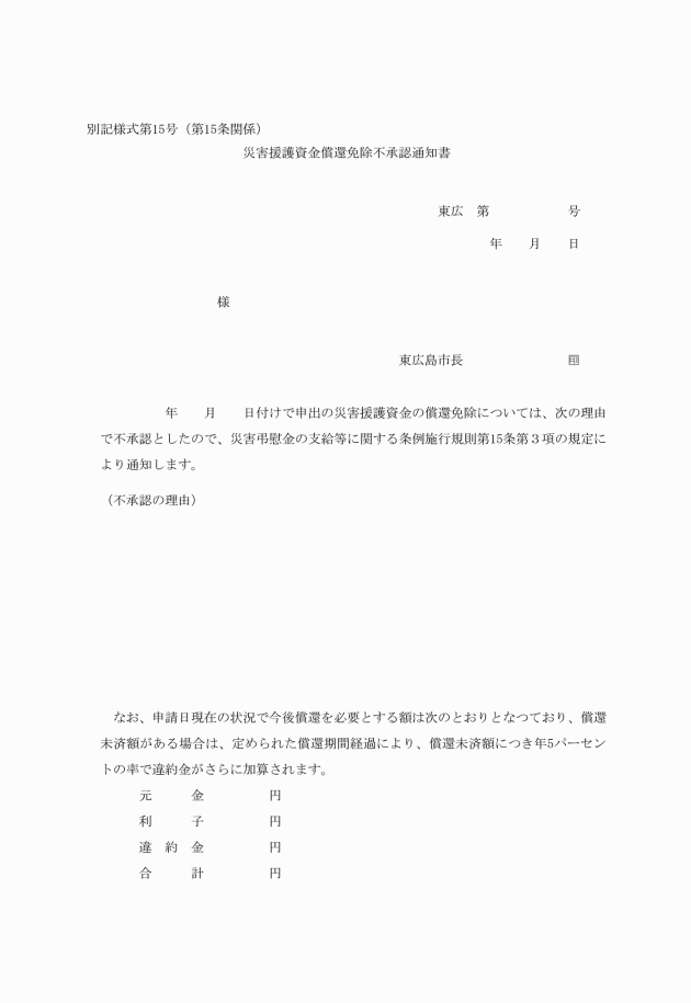 第14条 借受人は、違約金の支払の免除を申請しようとするときは、違約金支払免除申請書(別記様式第10号)を市長に提出しなければならない。