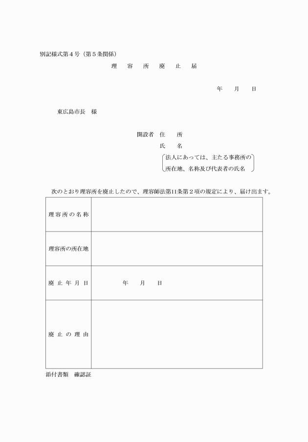 第2条 法第11条第1項の規定により理容所を開設しようとする者は、理容所開設届(別記様式第1号)に省令で定めるもののほか、次に掲げる書類を添えて、市長に届け出なければならない。