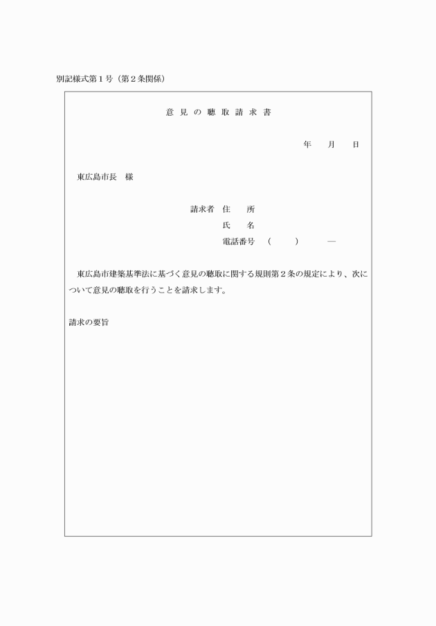 第2条 法第9条第3項又は第8項(法第10条第4項、第45条第2項、第88条第1項から第3項まで、第90条第3項及び第90条の2第2項において準用する場合を含む。)の規定により意見の聴取を行うことを請求しようとする者(以下「請求者」という。)は、意見の聴取請求書(別記様式第1号)を市長に提出しなければならない。
