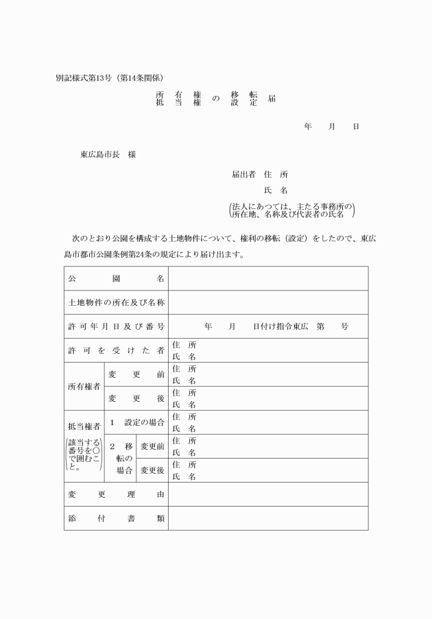 第13条 条例第16条ただし書の規定により使用料の還付を受けようとする者は、公園使用料還付申請書(別記様式第9号)を市長に提出しなければならない。