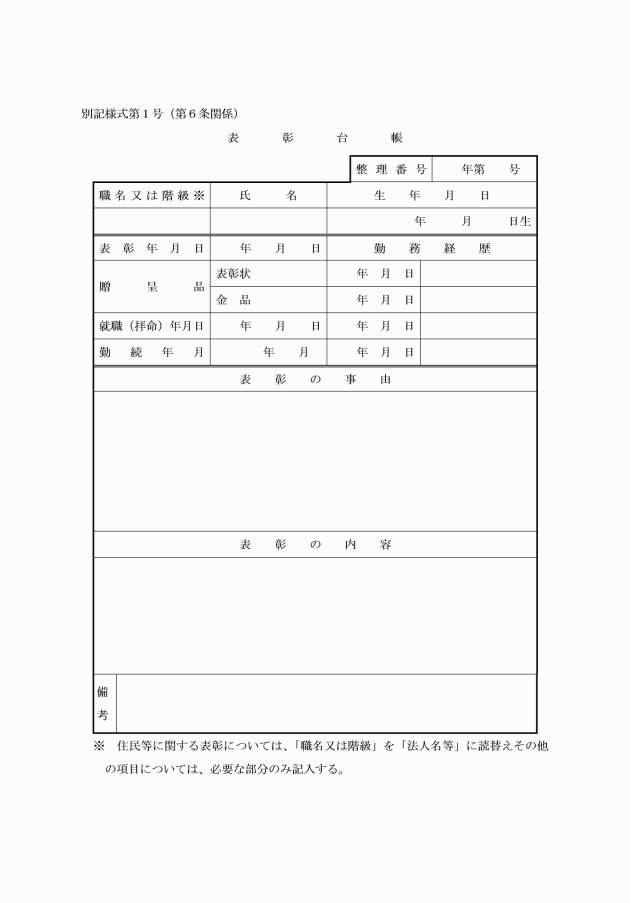 2 表彰の実施及びその他の事項は、表彰台帳(別記様式第1号)に記載する。