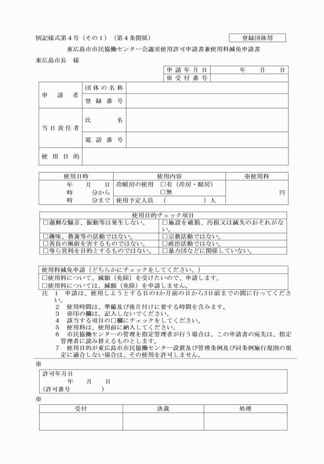 4 登録を受けた団体(以下「登録団体」という。)の代表者は、登録事項を変更しようとするときは、速やかに東広島市市民協働センター利用団体登録(登録事項変更)申請書(別記様式第1号)を市長に提出しなければならない。