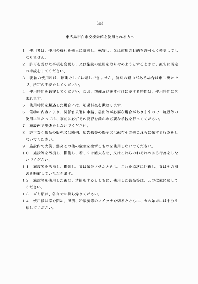 第3条 条例第7条第1項後段の規定による変更の許可(次項において「変更の許可」という。)を受けようとする者は、東広島市白市交流会館使用変更許可申請書(別記様式第3号)に使用許可書を添えて、市長に提出しなければならない。