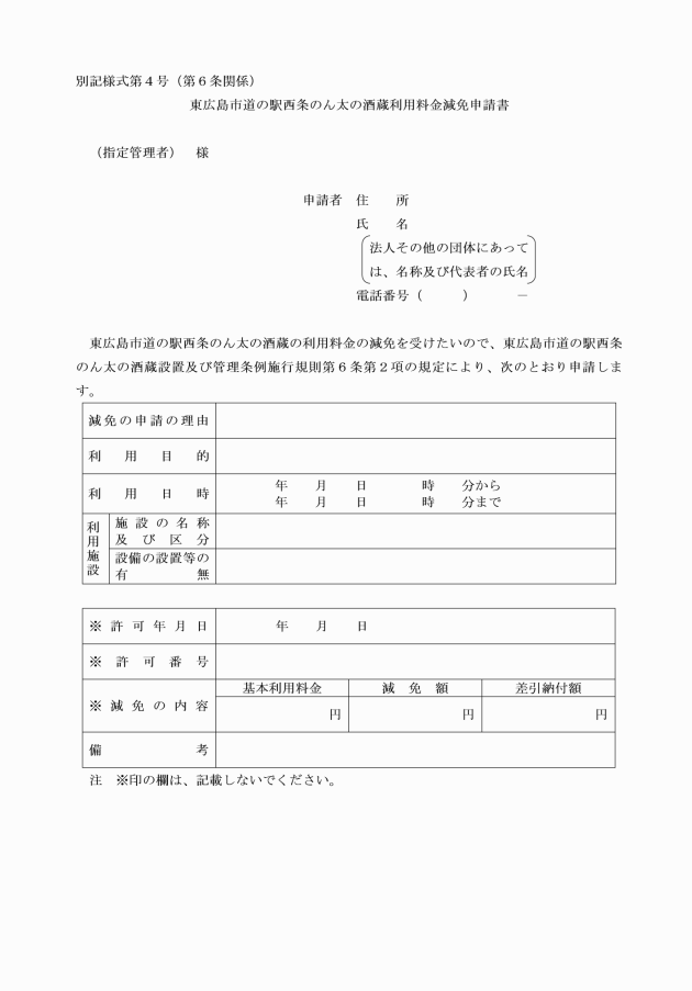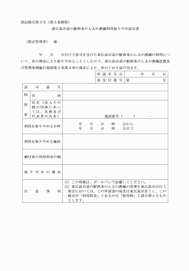 第5条 条例第7条第1項後段の規定による変更の許可を受けようとする者は、直ちに東広島市道の駅西条のん太の酒蔵利用変更許可申請書(別記様式第2号)に前条第1項の許可書を添えて、指定管理者に申請しなければならない。