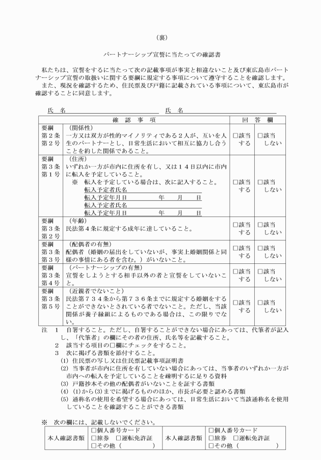 (1) パートナーシップにある2人のうち、いずれか一方が市内に住所を有し、又は宣誓の日から原則として14日以内に市内への転入を予定していること。
