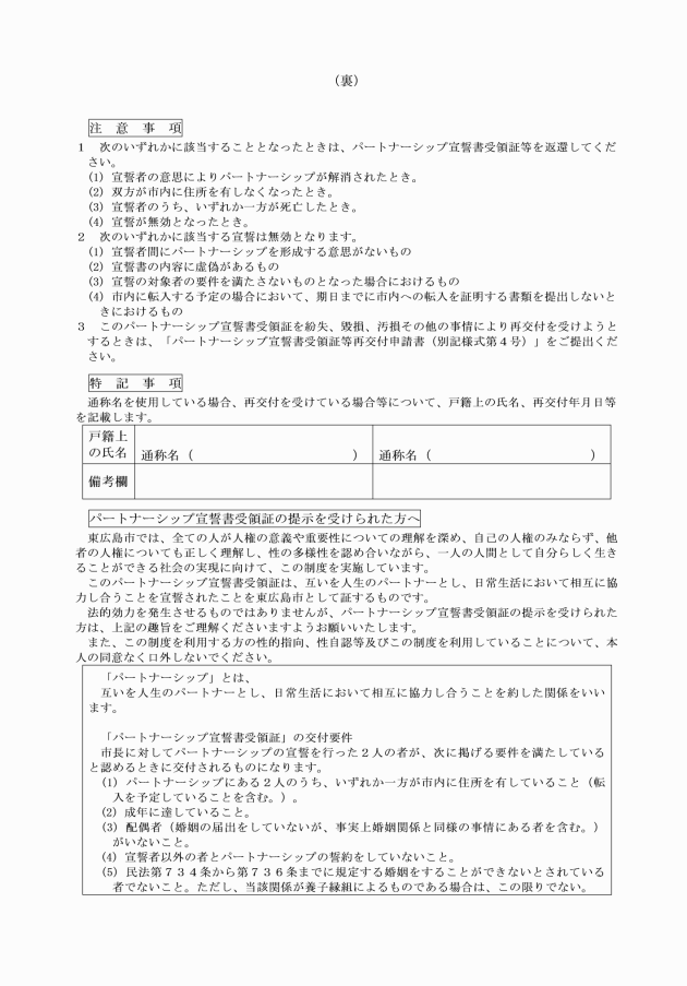 第4条 宣誓をしようとする者は、宣誓する日時、場所等を事前に市と調整した上で、市職員の面前においてパートナーシップ宣誓書(別記様式第1号。以下「宣誓書」という。)に自ら記入し、及び次に掲げる書類(宣誓日前3月以内に発行されたものに限る。)を添えて市長に提出するものとする。ただし、当事者の一方又は双方が自ら宣誓書に記入することができないときは、宣誓しようとする者及び市職員の立会いの下に、当事者以外の者にこれを代書させることができる。