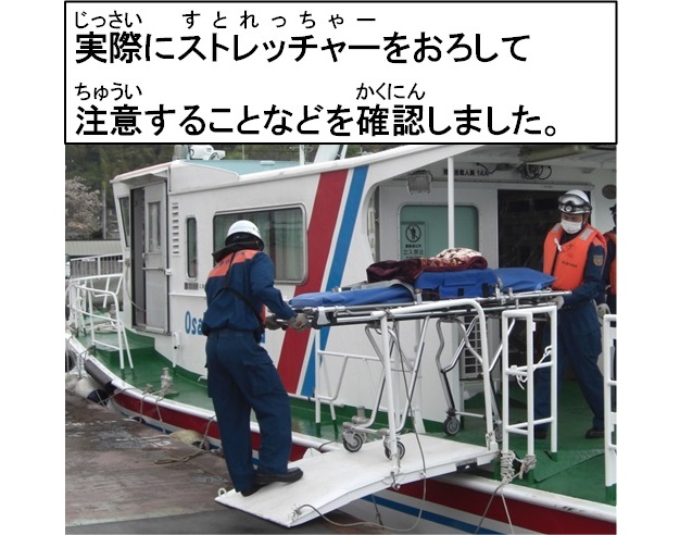 救急患者輸送艇を接岸させるときの、船側と陸側のお互いの役割や、船特有の注意点や安全管理方法などを確認したり、ストレッチャーの取扱いを行ったりして、安全に搬送を引き継げるようにしました。
