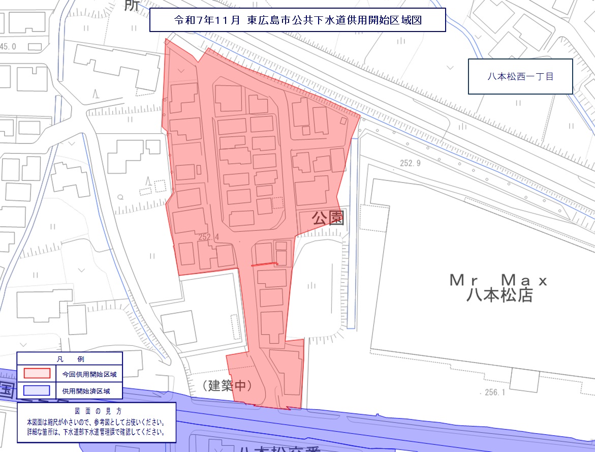 ※令和5年7月以降の供用開始区域をお知らせしています。これ以前の供用開始区域については、外部サイト「ひがしひろしまっぷ」から調べることができます。