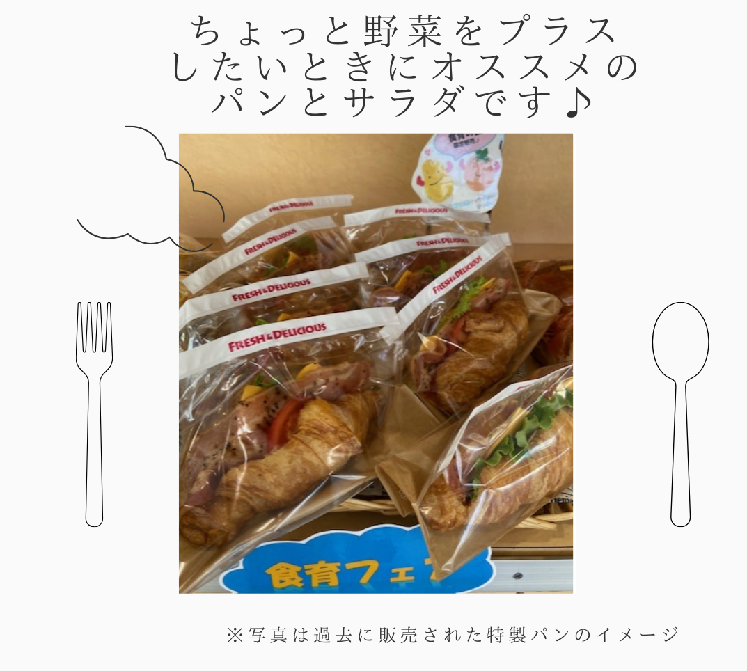 食育普及啓発品(食育ランチ、特製パン・サラダ)の販売依頼も行っています。詳しくは、医療保健課公式Instagram(hgh.city.kenkou)で紹介していますので、ぜひご覧ください。