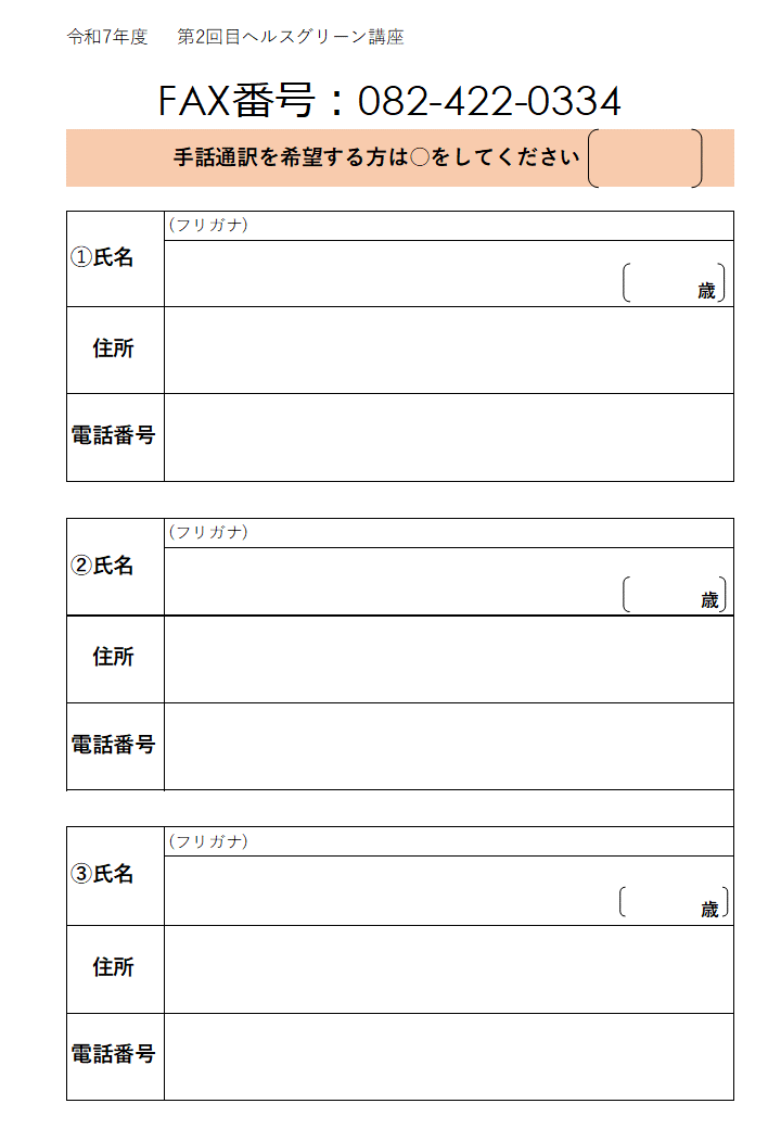 電話・ファックスまたは申込フォームで、氏名(ふりがな)・住所・電話番号・手話通訳の希望の有無を添えてお申し込みください。 |