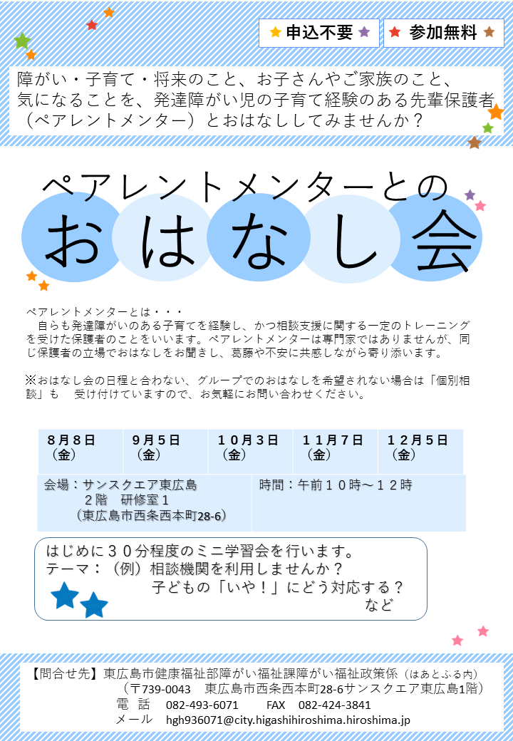 ペアレントメンターとお話したい方は障がい福祉課までお問い合わせください。