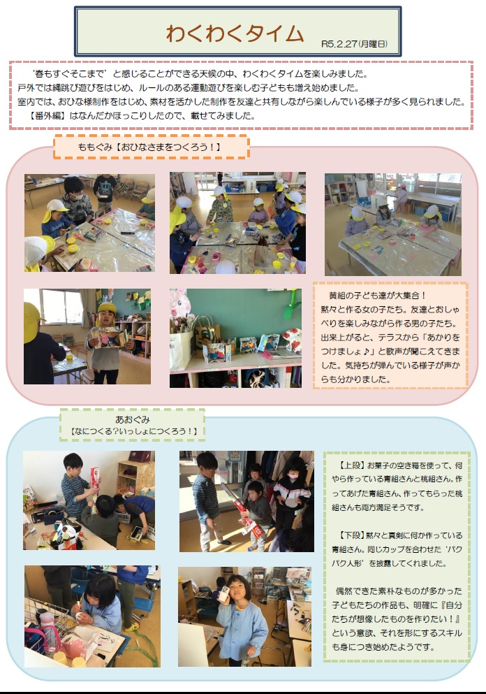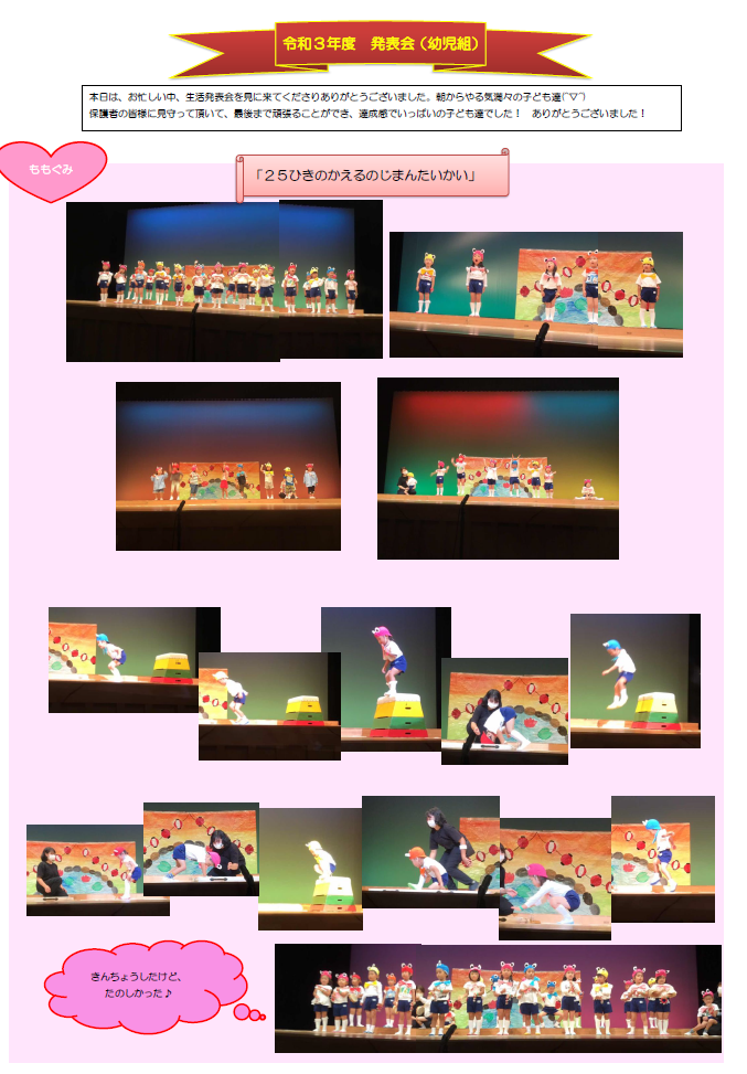 10月 Tweet 更新日:2025年03月01日 大改造劇的ビフォーアフター NO、2 R5年度 秋の遠足~龍王山公園へ~ 10月22日 生活発表会(乳児) 10月の誕生会 今日のわくわくタイム 令和4年度 生活発表会 ~幼児組~ 10月29日 秋の遠足(幼児組) 10月25日 わくわくタイム 10月の誕生会~幼児組~ 10月18日 久しぶりのわくわくタイム あおぞらさんぽ~青・黄組~ 令和3年度 発表会(幼児組)