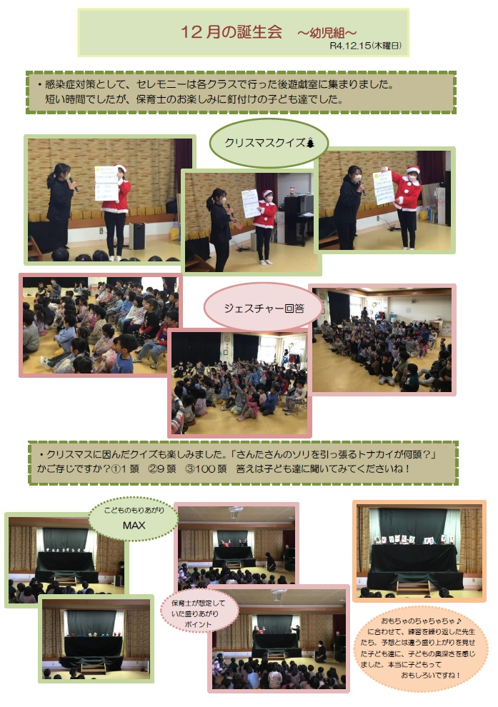 12月 Tweet 更新日:2024年05月01日 R5年度 お楽しみ会 寒い日こそ外遊び! もうすぐクリスマスがやって来る R4年度 お楽しみ会 主役は私たち 12月の誕生会 12月20日わくわくタイム(幼児組) 12月21日わくわくタイム(乳児組) 12月の誕生会・お楽しみ会 12月14日 乳児わくわくタイム