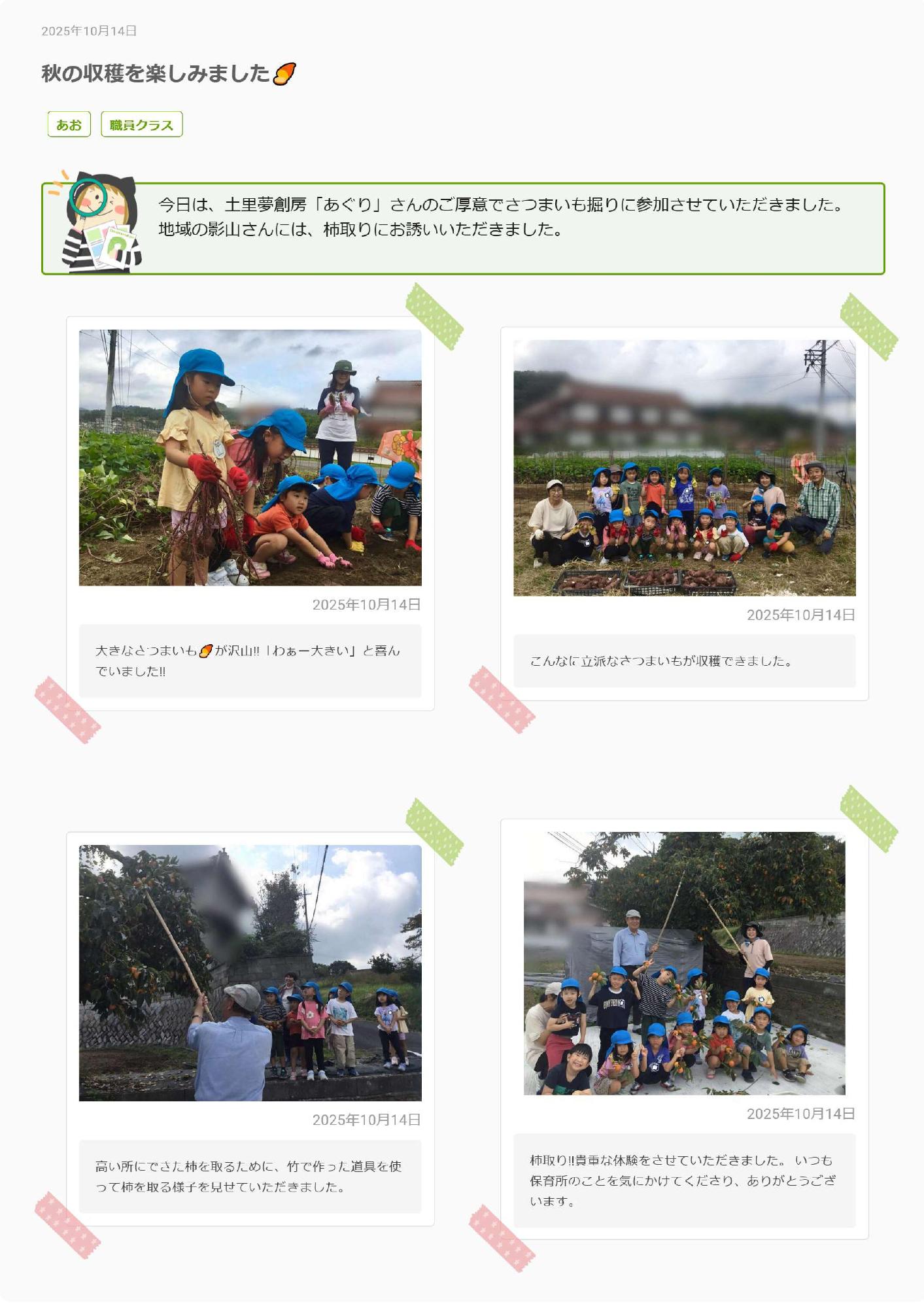 今日は、土里夢創房「あぐり」さんのご厚意でジャガイモ掘りに行きました。 ジャガイモの茎を引っ張ると、小さなジャガイモがいっぱい取れて「かわいい」と子どもたち。かわいいジャガイモの下を見ると、土に中には大きなジャガイモが隠れていました。周りの土を一生懸命掘り、大きなジャガイモが取れ「やったー‼︎大きいのが取れた‼︎」と喜んでいました。 保育所に持ち帰り、ジャガイモの数を数えると小さなイモから大きなイモまで全部で700個ほどありました。 あぐりさんから「おうちで美味しく食べてね」と言っていただき子どもたちは、喜んでいました。 ★芋の窪みが赤いのは、「キタアカリ」という品種のジャガイモの特徴ですので、食べても問題ありません。緑の部分は、有毒成分のソラニン類が多く含まれるため、皮を厚めにむき、芽のまわりの部分を多めに取り除き食べないようにしてくださいね。