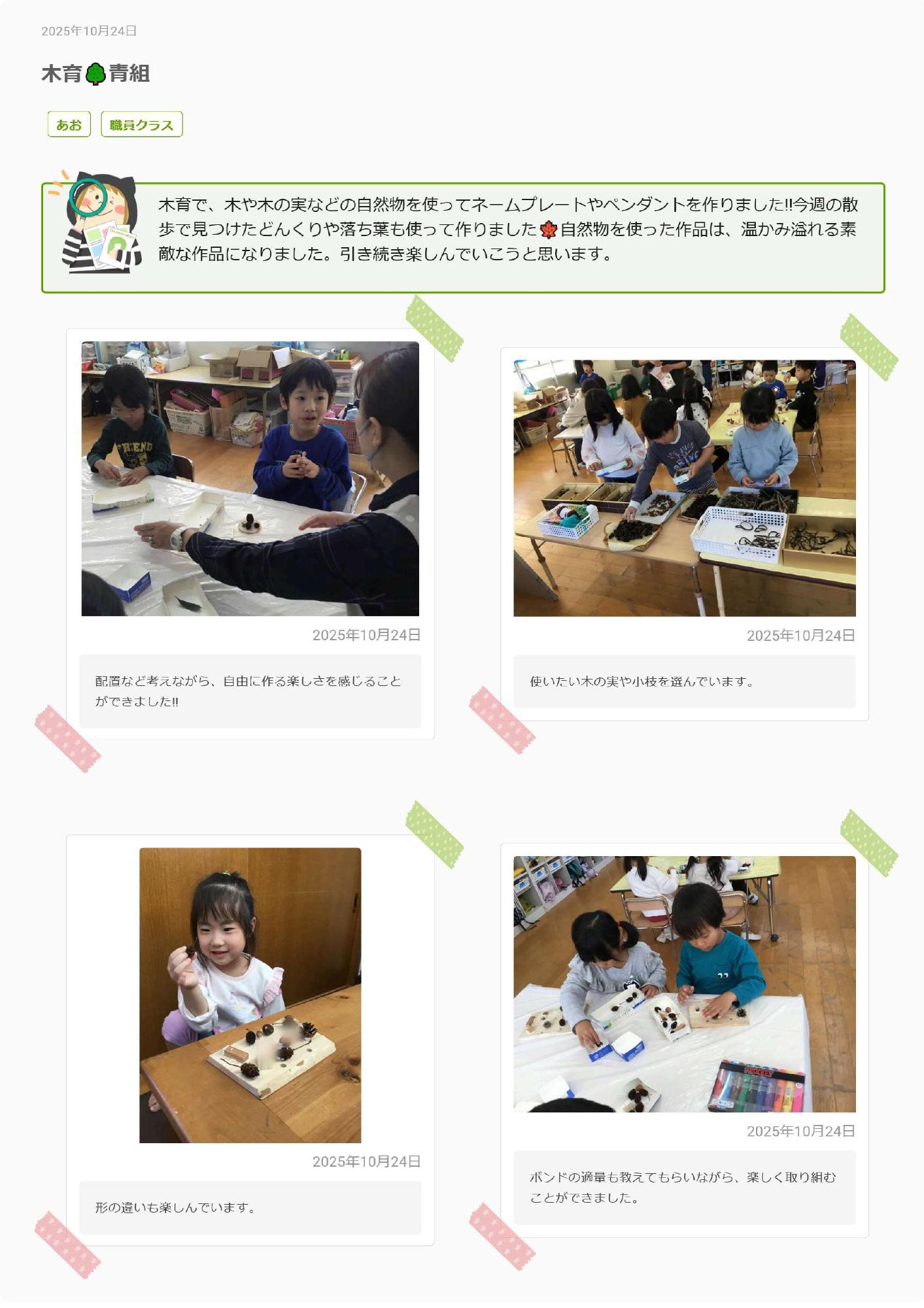 今日は、黄組と青組で階段下公園まで散歩に行きました。 横断歩道を渡り左右を確認し、車がいないことを確認しながら安全に渡ることができました。公園に着くと、栗、どんぐり、松ぼっくり、もみじなどを見つけ、秋の自然に触れることができました。遊具でも遊び、友だちと関わりながら楽しい散歩になりましたよ。